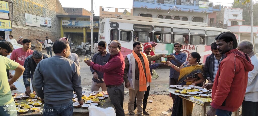 जसरा बाजार में व्यापारियों ने श्रद्धालुओं को वितरित किया तहरी और पूड़ी सब्जी