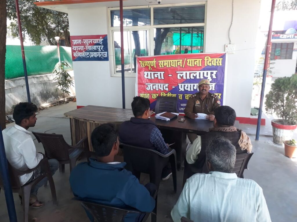 बारा प्रयागराज: थाना लालापुर थाना प्रभारी अजय मिश्रा महाकुंभ में ड्यूटी लगने की वजह से उपनिरीक्षक सब इंस्पेक्टर इंद्रेश कुमार की मौजूदगी में संपूर्ण समाधान थाना दिवस संपन्न हुआ एस आई कौशलेंद्र कांस्टेबल राहुल पटेल और लालापुर पुलिस के निर्देश पर जन समस्याओं के त्वरित निस्तारण के उद्देश्य से आज शनिवार को लालापुर में थाना समाधान दिवस का आयोजन किया गया। जिसमें एस आई इंद्रेश कुमार आयोजित थाना समाधान दिवस में जन समस्याओं को सुना एवं उनके गुणवत्तापूर्ण निस्तारण किया हेतु । लालापुर थाना क्षेत्रों में जो भी समस्याएं हैं चाहे भूमि विवाद से संबंधित हो तथा नाली, चकमार्ग पर कब्जे, सरकारी भूमि पर कब्जे, तालाबों पर कब्जे, अवैध अतिक्रमण इत्यादि से संबंधित शिकायतें हो उनको तत्काल संज्ञान में लेकर निस्तारण कराया जाए तथा जहां पर पुलिस बल की आवश्यकता हो वहां पर लालापुर थाने से संपर्क कर पुलिस टीम के साथ मौके पर जाकर शिकायत का निस्तारण किया जाए। आज थाना दिवस के दौरान प्राप्त शिकायतों के गुणवत्तापूर्ण निस्तारण हेतु।आज थाना दिवस पर कोई भी शिकायत पत्र नहीं आया। जब से थाना लालापुर का कारभार अजय मिश्रा ने संभाला तब से क्राइम पर लगाम लगा दी