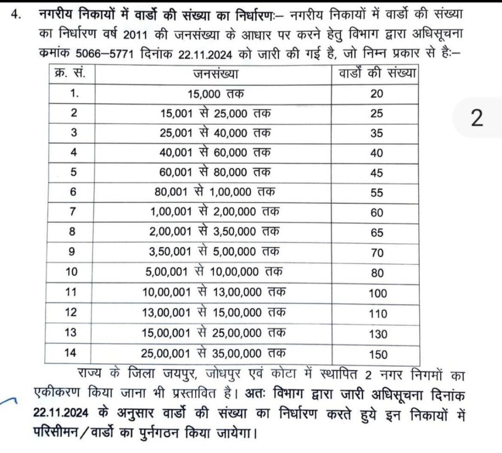 1.मई तक प्रस्ताव तैयार करके सरकार को भिजवाने के निर्देश 2की जगह जयपुर जोधपुर और कोटा मे एक एक होंगे नगर निगम. उसी अनुसार करना होगा एक निगम के लिए परिसिमन -वार्डो का पुनर्गटन. जिला निर्वाचन अधिकारी वीसी के जरिये देंगे ट्रेनिंग. सभी निकयो के EO. आयुक्त समेत अन्य अधिकारियो को देंगे ट्रेनिंग