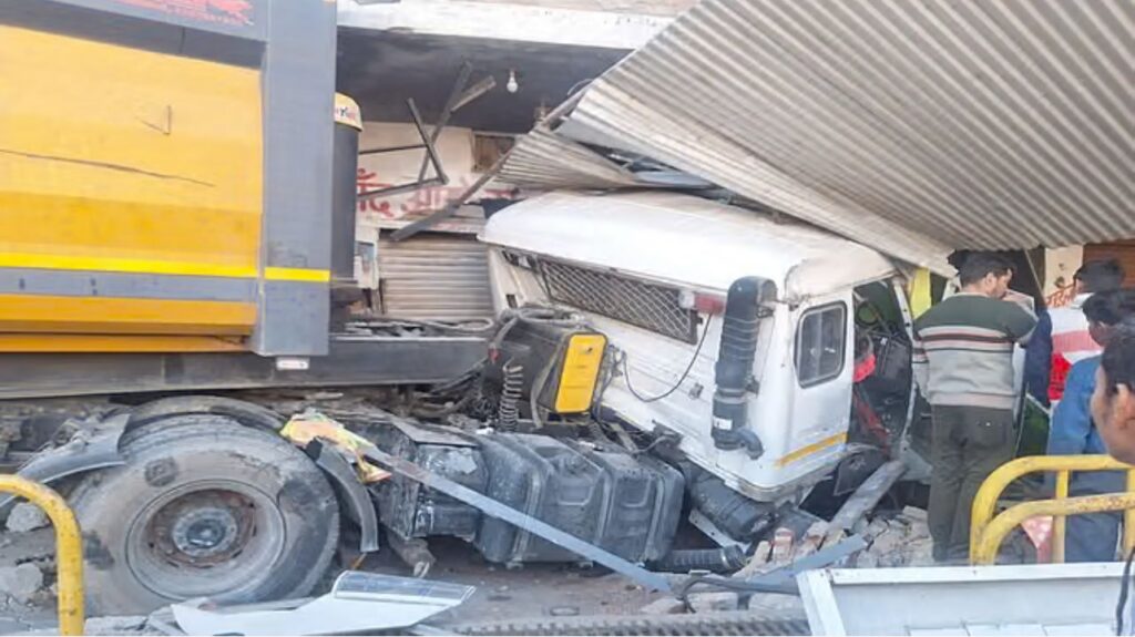 कैंटर को टक्कर मारते हुए 3 दुकानों में घुसा तेज रफ्तार ट्रक