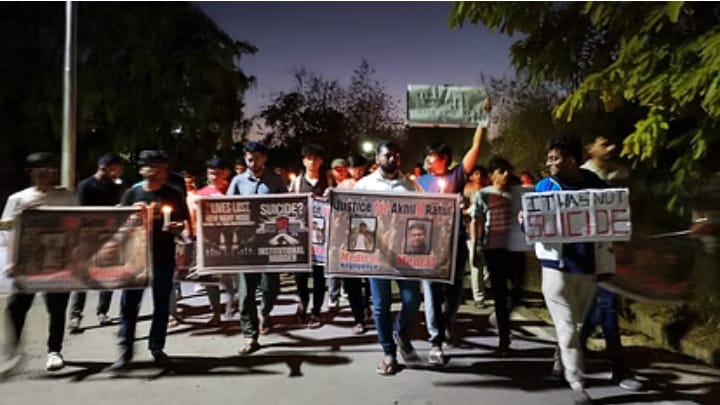 प्रयागराज।। ट्रिपलआईटी में शनिवार को दो साथियों की मौत से भड़के छात्रों ने जमकर हंगामा किया। संस्थान प्रशासन पर अनुशासन के नाम पर उत्पीड़न, छात्र सुविधाओं में बदहाली का आरोप लगाकर विरोध जताया।रात में 12 बजे से सुबह छह घंटे तक हंगामा करने के बाद शाम को एक बार फिर वह विरोध प्रदर्शन शुरू कर दिया। कैंडल मार्च निकालने के बाद उन्होंने निदेशक कार्यालय पर धरना शुरू कर दिया, जो रात 11 बजे खबर लिखे जाने तक जारी था।छात्रों का आरोप था कि फैकल्टी की अनुशासन के नाम पर उत्पीड़न ही राहुल की मौत का कारण है। वहीं, अखिल की जान समय पर मेडिकल सुविधा न मिलने के कारण हुई। इसी को लेकर छात्र सुबह तक प्रदर्शन करते रहे।शाम छह बजे से छात्र फिर से एकजुट होकर मांगों के साथ कैंडल मार्च निकाला और देर रात तक निदेशक कार्यालय पर धरना देते रहे। छात्र राहुल और अखिल की मौत के बाद रविवार को निदेशक के कार्यालय में देर रात तक हंगामा चलता रहा। छात्र साथी के परिवार के लिए कॉलेज में एक नौकरी, मुआवजा और परिवार के लिए आजीवन स्वास्थ्य बीमा की मांग करते हुए देर रात तक डटे रहे।अवकाश पर होने के कारण निदेशक प्रो. मुकुल शरद सुतावने अपने गृह जनपद पुणे में थे। सूचना पाकर वह फ्लाइट से पहले वाराणसी और वहां से सड़क मार्ग से देर रात ट्रिपलआईटी पहुंचे। कॉलेज पहुंचते ही उन्होंने छात्रों को अपने कार्यालय में वार्ता के लिए बुलाया। छात्रों का एक प्रतिनिधिमंडल उनसे वार्ता करने पहुंचा, जबकि अन्य छात्र धरने पर बैठे रहे। छात्रों और निदेशक के बीच तकरीबन दो घंटे तक वार्ता होती रही लेकिन छात्रों को कोई ठोस आश्वासन नहीं मिला। कई बार छात्रों ने तल्ख लहजे में गुस्सा भी जाहिर किया। छात्रों ने कहा कि राहुल और अखिल की मौत के लिए ट्रिपलआईटी प्रशासन की जिम्मेदारी तय की जाएगी और संबंधित अफसरों के खिलाफ मुकदमा दर्ज कराते हुए कार्रवाई की जाए।