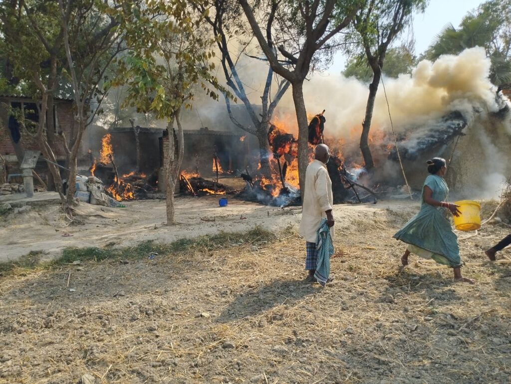 धीरे —धीरे तीन मड़ई में आग लग गई थी जिसे पास पड़ोस के लोग पानी से आग बुझाने का प्रयास कर काबू पा लिया गया था। गृहस्वामी डगरन बिंद ने बताया कि हम खेत में गए हुए थे घर की महिलाएं और बच्चे दूसरे घर में थे तब तक एक मड़ई में आग लग गई फिर उससे सट कर दो और मड़ई जल कर राख हो गई।मड़ई में गृहस्थी का सामान ,गेहूं और भूंसा आदि रक्खा हुआ था जो जल कर राख हो गया।आग लगने के कारण का पता नहीं चल सका जबकि विद्युत आपूर्ति ठप थी।समाचार लिखे जाने तक कोई भी जिम्मेदार अधिकारी नहीं पहुंचा था।