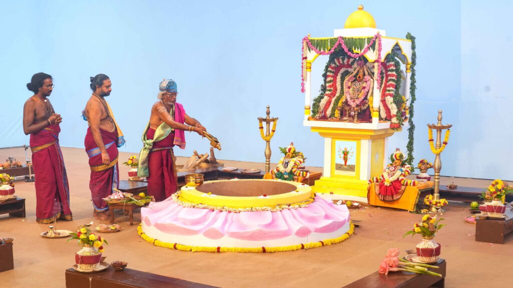 फोंडा (गोवा) – भारत की विजय, साथ ही सैनिकों, साधकों और देश-विदेश के सनातन धर्मप्रेमियों की रक्षा के उद्देश्य से ‘सनातन राष्ट्र शंखनाद महोत्सव’ के उपलक्ष्य में गोवा इंजीनियरिंग कॉलेज के मैदान में 35 पुरोहितों द्वारा शतचंडी यज्ञ विधिपूर्वक सम्पन्न हुआ। यज्ञ की सिद्धि तथा सनातन संस्था का कार्य सतत् बढ़ता रहे, इस हेतु 22 मई को गोवा के रामनाथी स्थित सनातन संस्था के आश्रम में ‘श्री ललिता त्रिशती देवी’ का पूजन भक्तिपूर्वक किया गया। इस विशेष पूजन में तमिलनाडु से आए पूज्य श्री गुरुमूर्ति शिवाचार्य एवं श्री अरुणकुमार गुरुमूर्ति ने त्रिपुरासुंदरी देवी के त्रिशती नामों का उच्चारण कर पुष्पार्चन किया।