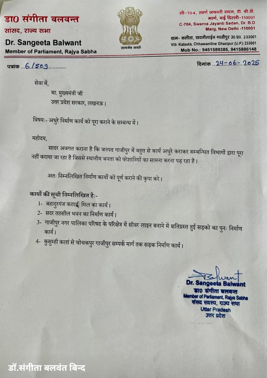 ग़ाज़ीपुर।24जून को ग़ाज़ीपुर में समीक्षा बैठक में आए उत्तर प्रदेश के मुख्यमंत्री योगी आदित्यनाथ को भाजपा की राज्य सभा सांसद डॉ. संगीता बलवंत बिंद ने गाजीपुर जनपद में जनहित में निम्नलिखित कार्यो का कराया जाना आवश्यक के संबंध में पत्र देकर अवगत कराया जिसमें जनपद गाजीपुर के साथ- साथ जनपद बलियां, चन्दौली एवं आजमगढ़ के लोगों हेतु सुगमता प्रदान करेगा। जनपद गाजीपुर में विश्वविद्यालय की शीघ्र स्थापना,चोचकपुर से नगवा गंगा नदी में पक्का पुल का निर्माण,गाजीपुर से चोचकपुर होते हुए सैदपुर तक फोर लेन सड़क का निर्माण,गाजीपुर से भरौली होते हुए बलियां तक फोर लेन सड़क का निर्माण, गाजीपुर से चिरैयाकोट होते हुए आजमगढ़ तक फोर लेन सड़क का निर्माण, नंदगंज चीनी मिल का पुनः निर्माण व संचालन या उसके समकक्ष कोई अन्य निर्माण जो जनपद वासियों को रोजगार प्रदान कर सके,जमानियां मोड़ से चौकिया मार्ग तक बाईपास सड़क का निर्माण, मलसा से वयेपुर देवकली गंगा नदी में पक्का पुल का निर्माण।दूसरा पत्र अधुरे निर्माण कार्य को पूरा कराने के सम्बन्ध में लिखा जो निम्न है