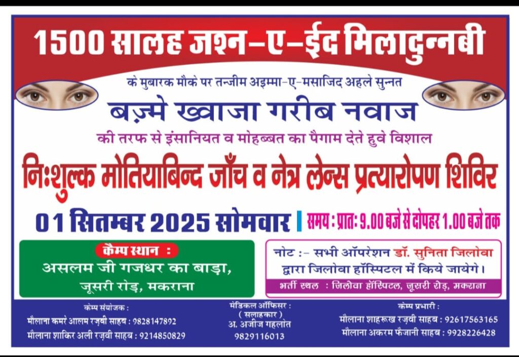 जिले के मकराना सिटी मे 1.9.20025 को आँखो का निशुल्क केंम्प रखा गया है.