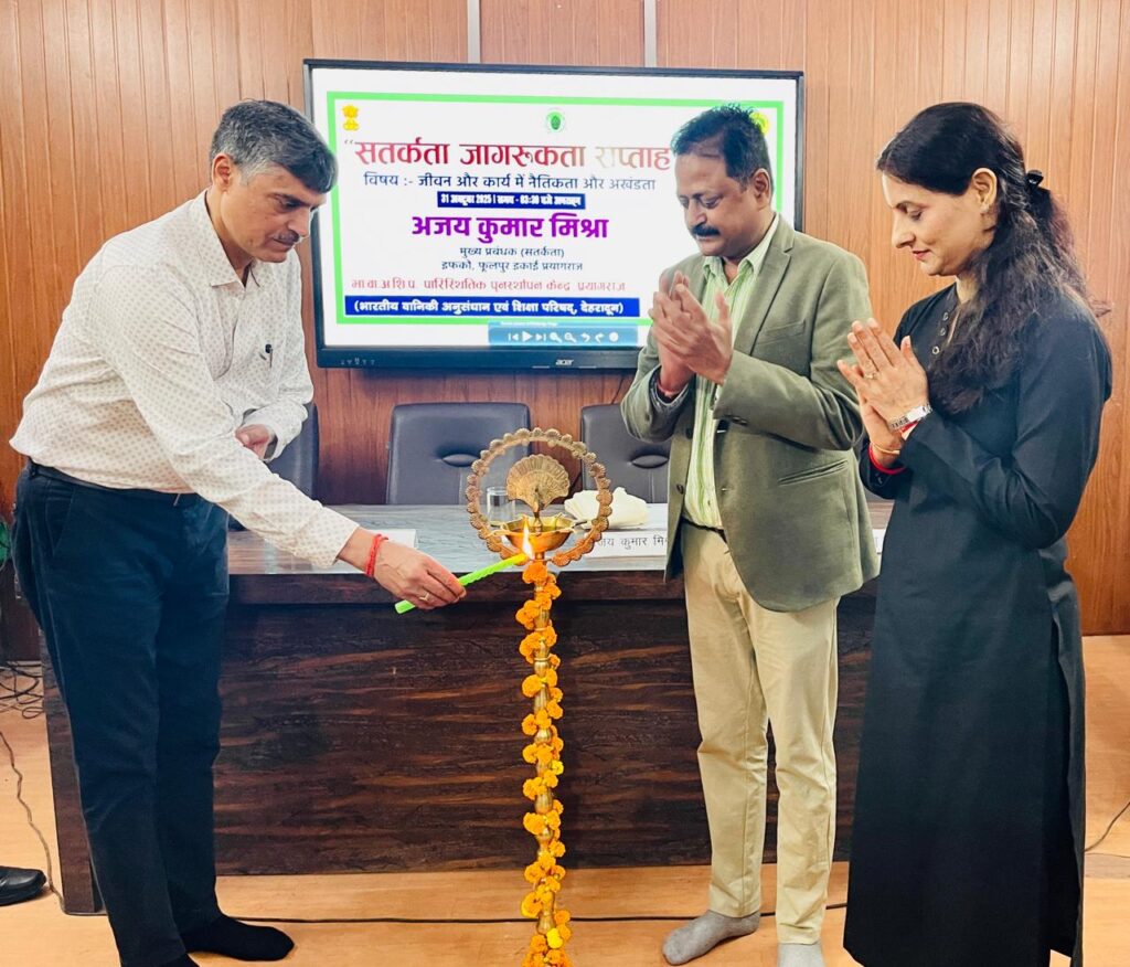 भा.वा.अ.शि.प.-पारिस्थितिक पुनस्र्थापन केन्द्र, प्रयागराज द्वारा सतर्कता जागरूकता सप्ताह के अन्तर्गत ‘‘जीवन और कार्य में नैतिकता और अखण्डता’’ विषय पर एक दिवसीय जागरूकता कार्यशाला का आयोजन दिनांक 31.10.2025 को किया गया। कार्यशाला का शुभारम्भ मुख्य अतिथि एवं वक्ता अजय कुमार मिश्रा, मुख्य प्रबन्धक (सतर्कता), इफको-फूलपुर इकाई, प्रयागराज तथा विशिष्ट अतिथि प्रसिद्ध रंगमंच, निदेशक, प्रवीण शेखर द्वारा दीप प्रज्ज्वलन के साथ किया गया। सरकारी एवं गैर-सरकारी कार्यों में समान व्यवहार रखते हुए पारदर्शिता को बनाए रखना ही कार्यशाला का मुख्य उद्देश्य बताया गया। केन्द्र प्रमुख डाॅ. संजय सिंह ने स्वागत भाषण प्रस्तुत करते हुए कहा कि सतर्कता जागरूकता का उद्देश्य भ्रष्टाचार, अनियमितता और लापरवाही को रोकना है ताकि समाज और देश में स्वच्छ प्रशासन स्थापित हो सके। इसी क्रम में उन्होने कहा कि जब सामान्य नागरिक, अधिकारी एवं कर्मचारी आदि सतर्क रहते हैं, तो गलत कार्यों की सम्भावना कम हो जाती है। मुख्य अतिथि एवं वक्ता अजय कुमार मिश्रा ने कार्यशाला विषय पर व्याख्यान प्रस्तुत करते हुए कहा कि जीवन और कार्य में नैतिकता और अखण्डता का अत्यन्त महत्वपूर्ण स्थान है। नैतिकता का अर्थ है सही और गलत के बीच भेद कर सही मार्ग का चयन करना, जबकि अखण्डता का अर्थ है अपने सिद्धान्तों, मूल्यों और वचनों के प्रति ईमानदार रहना। ये दोनों गुण व्यक्ति के चरित्र की नीव होते हैं तथा उसके जीवन की दिशा तय करते है। इसी क्रम में उन्होने सभा को सम्बोधित करते हुए अपने विचारों को साझा किया। केन्द्र की सतर्कता अधिकारी एवं वरिष्ठ वैज्ञानिक डाॅ. अनीता तोमर ने धन्यवाद ज्ञापन प्रस्तुत करते हुए कहा कि यदि हर व्यक्ति अपने कार्य में ईमानदारी और पारदर्शिता रखें, तो देश प्रगति की नई ऊचाइयों को छू सकता है। आयोजित कार्यशाला में केन्द्र के समस्त अधिकारी एवं कर्मचारी गण के साथ इफको के रजनीश मिश्रा आदि उपस्थित रहे।